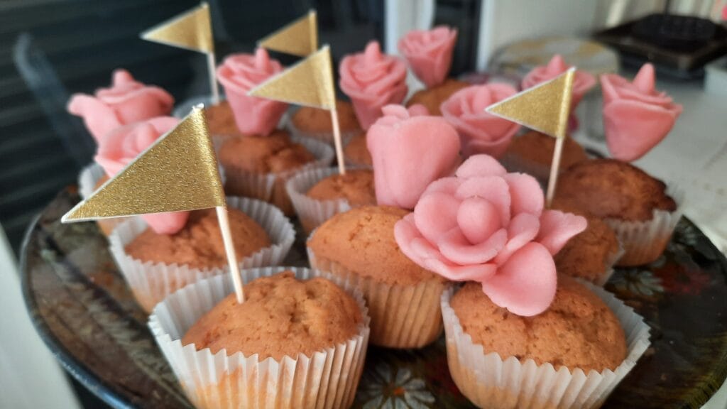 Sur les cupcakes refroidis, planter les cure-dents avec les roses ainsi que d’autres décoration. C’est prêt à servir !