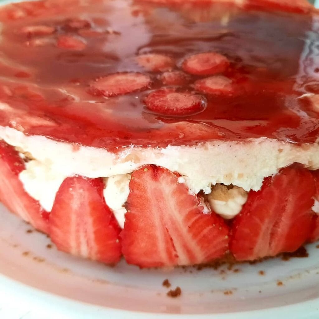 - Retirer le cercle à pâtisserie et décorer avec des morceaux de fraises ou avec un reste de crème par exemple.