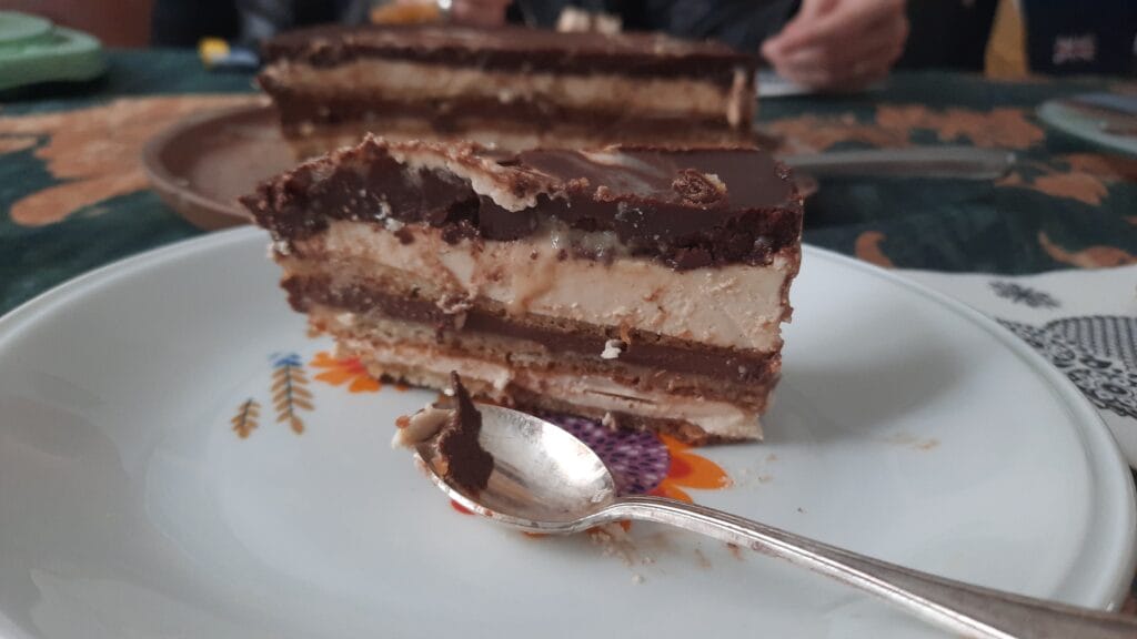 Cependant, le Gâteau Opéra ne s’arrête pas là. Il révèle une couche subtile de crème au beurre au café, introduisant une note audacieuse et parfumée qui complète parfaitement l’intensité du chocolat. L’alliance du café et du chocolat crée une expérience sensorielle complexe, unissant l’amertume profonde du café à la douceur du chocolat.