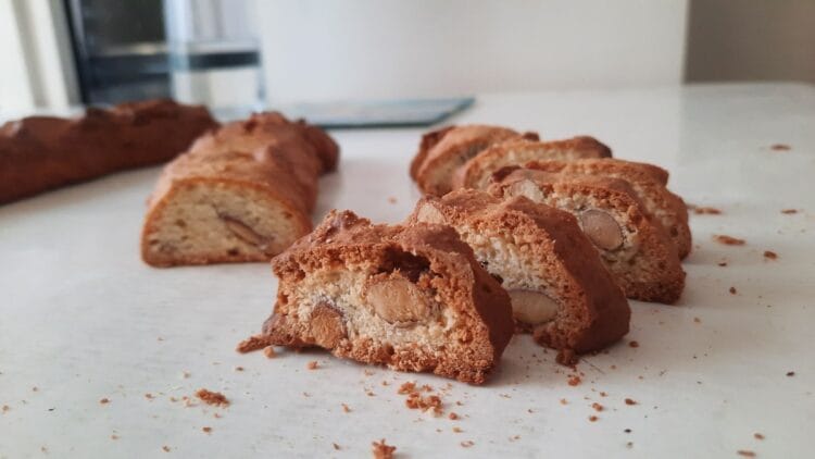 Ensuite, les bûches sont sorties du four et laissées refroidir légèrement pour pouvoir être manipulées. C’est à ce moment-là qu’intervient l’étape cruciale de la découpe. Les bûches sont tranchées pour former des tranches d’environ un centimètre d’épaisseur. Ainsi, elles sont ensuite disposées sur la plaque de cuisson et remises au four pour une deuxième cuisson afin de les rendre bien croustillantes.