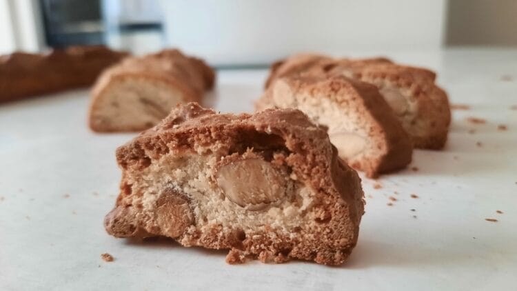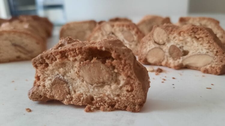 Une fois les amandes grillées et refroidies, on les incorpore à une pâte. Alors à base de farine, de sucre, d’œufs, de beurre, de vanille et d’une pincée de sel, elle est déjà délicieuse à ce stade. La pâte obtenue est assez ferme. C’est cela qui permet de former des bûches allongées sur la plaque de cuisson. Ces bûches sont ensuite cuites jusqu’à ce qu’elles soient légèrement dorées et fermes au toucher.