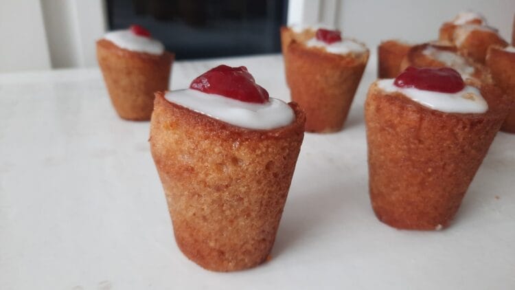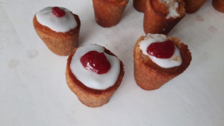 - Disposer le glaçage sur le dessus des gâteaux et terminer par une couche de confiture de framboise.