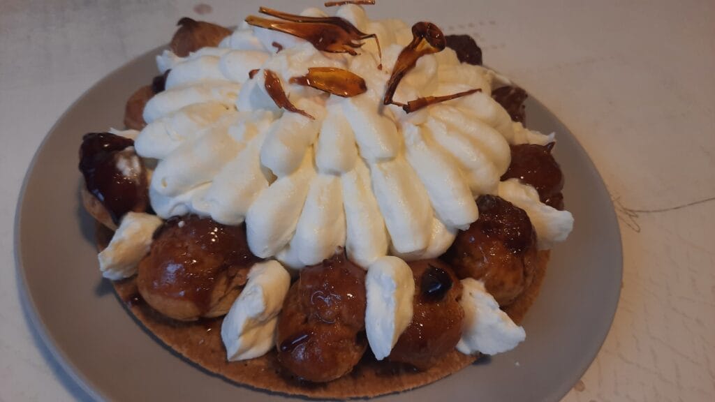 - Disposer sur le pourtour les choux et garnir le centre du reste de crème (vous pouvez ensuite décorer avec des restes de caramel refroidis).