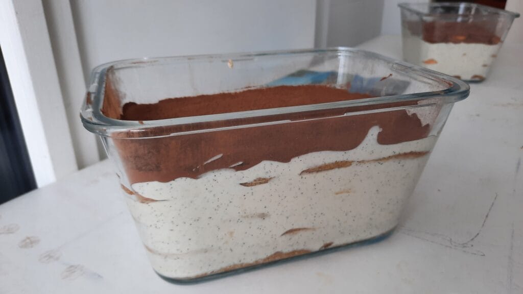 Faire votre café. Le laisser refroidir puis le verser dans un bol (si ce n’est pas déjà fait). Imbiber les biscuits cuillères et tapisser le fond de votre plat/moule. Nous, faute de moule adéquat, nous avons utilisé deux tupperware.